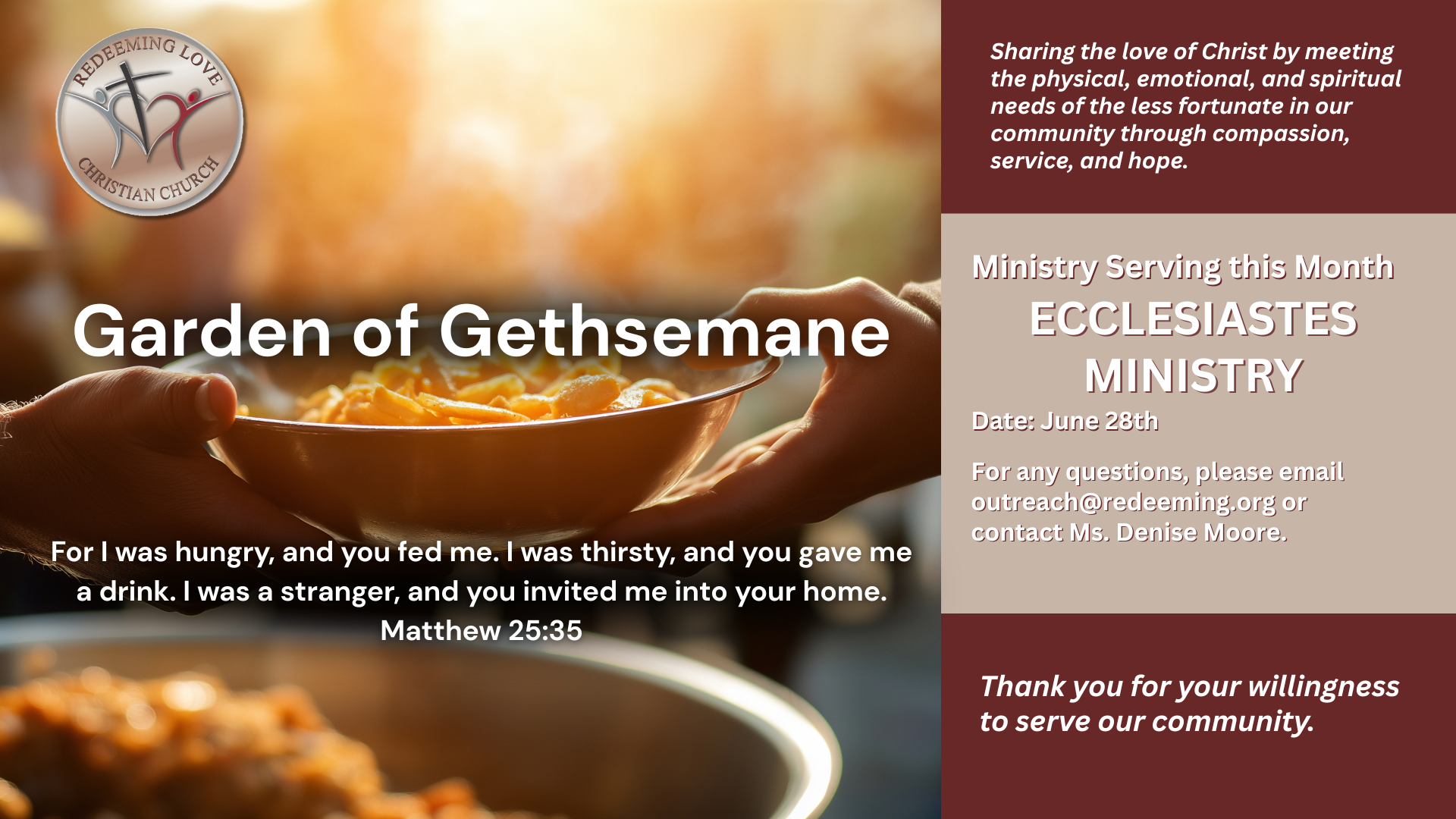 Welcome to Redeeming Love Christian Church where we are called to demonstrate God’s love that